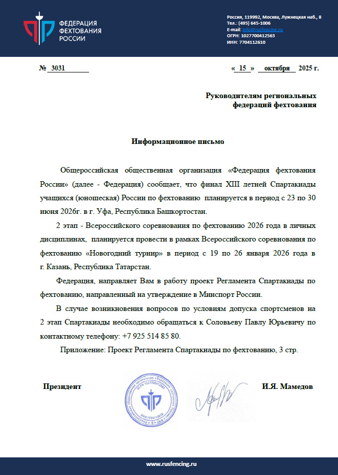 Федерация фехтования России подготовила проект регламента XIII летней Спартакиаде учащихся 2026 года.