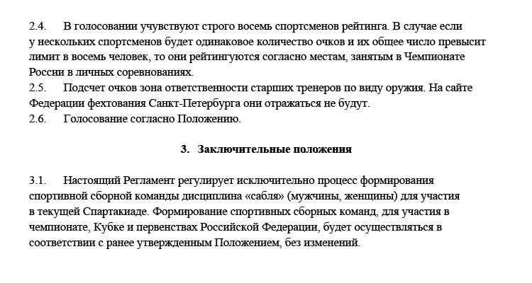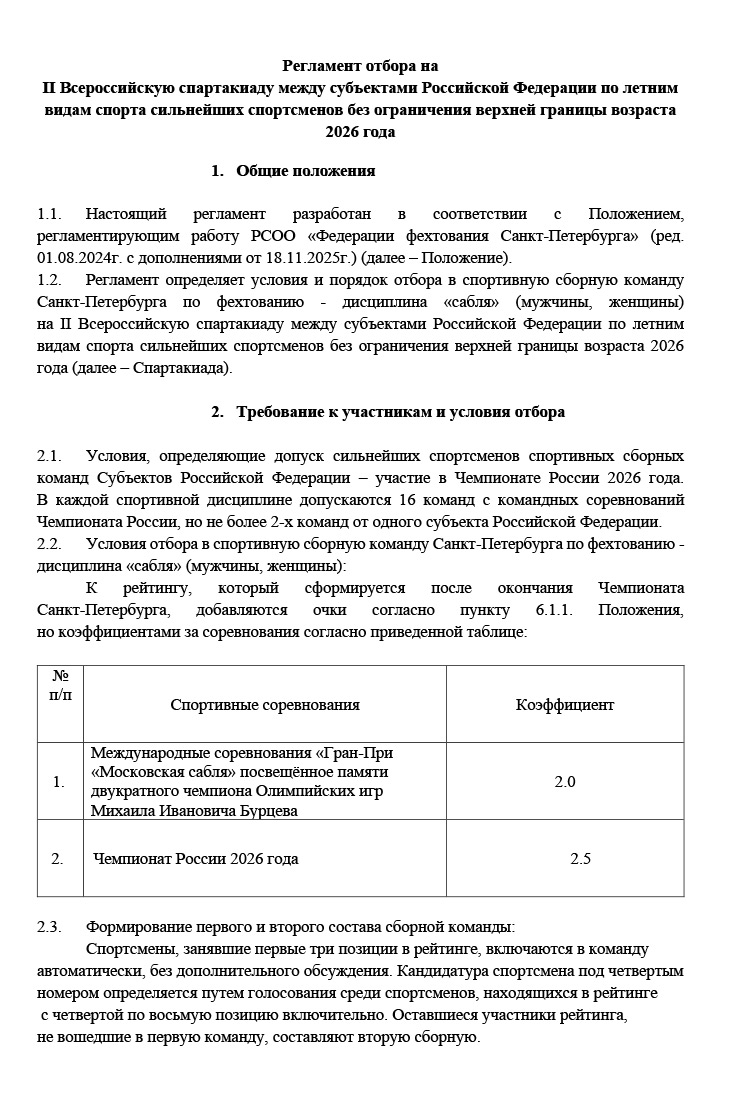 Подготовлен регламент отбора в сборную Санкт-Петербурга по сабле для участия во II Всероссийской спартакиаде между субъектами Российской Федерации (взрослые).