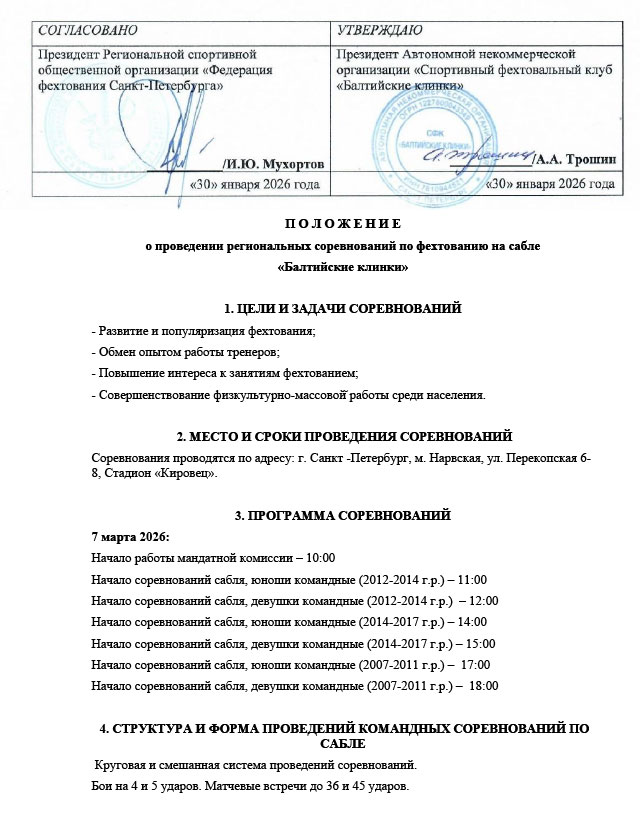 16 февраля 2026 года обновлено Положение об открытом Первенстве клуба «Балтийские клинки» по командной сабле среди юношей и девушек 2007-2010, 2011-2013, 2014-2016 г.р., которое состоится 7 марта 2026 года.